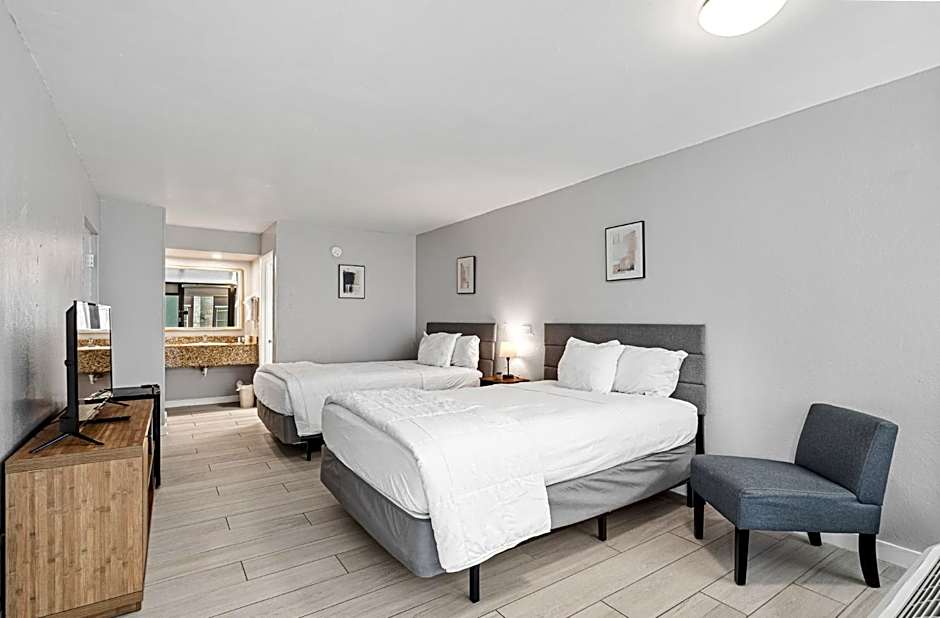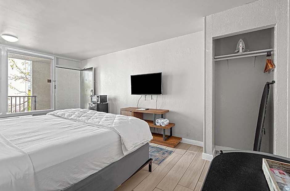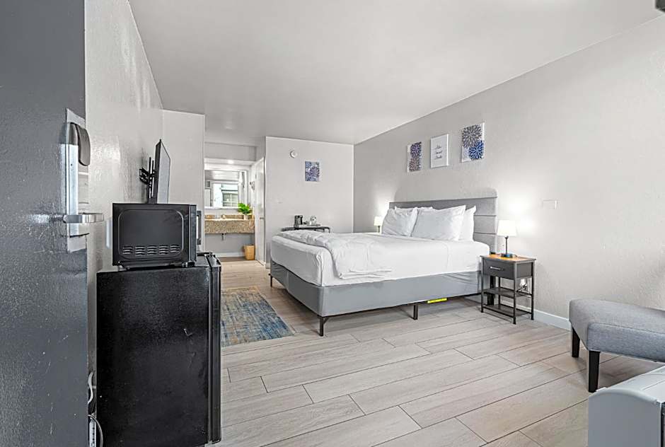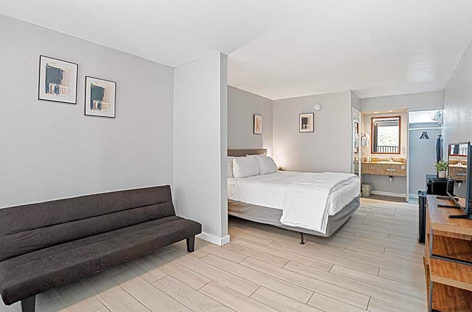 This suite features a cable TV, seating area with a sofa bed, and desk. A small refrigerator and a microwave are also included.